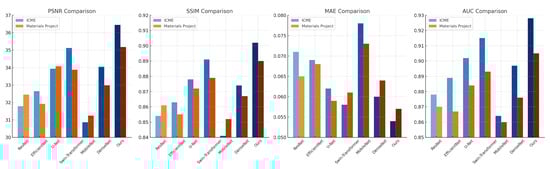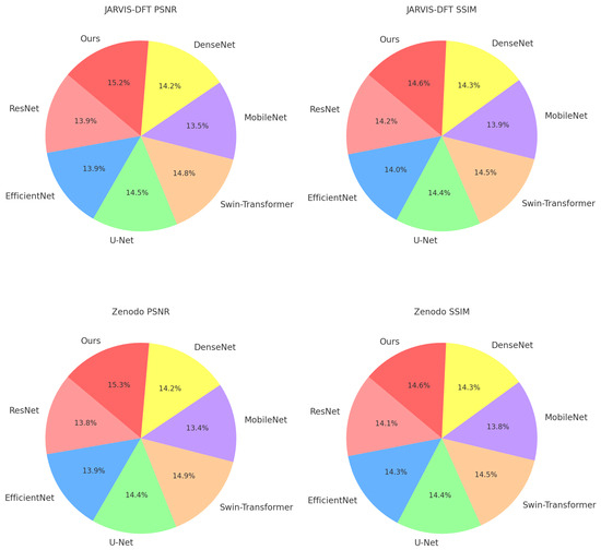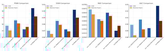 The ablation study evaluates the contributions of individual modules in our proposed architecture by systematically removing them and assessing performance across four datasets: JARVIS-DFT, Zenodo, ICME, and Materials Project. Table 3 and Table 4 provide detailed metrics for model variants, including PSNR, SSIM, RMSE, MAE, and AUC, illustrating the impact of each module. The results confirm that each module contributes significantly to the overall performance, with the full model consistently outperforming its ablated counterparts.