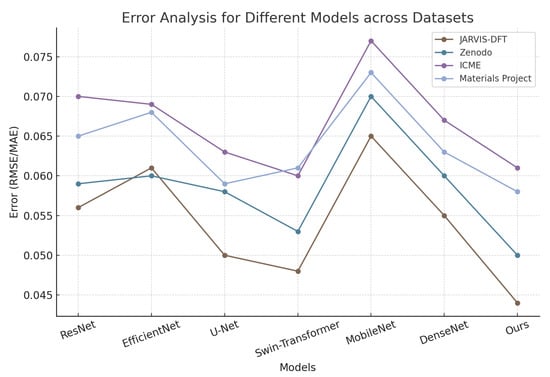 In the error analysis of this study, we compared the performance of different models across the JARVIS-DFT, Zenodo, ICME, and Materials Project datasets. As shown in Table 5, the errors of various models exhibit noticeable differences across datasets. ResNet and EfficientNet yielded errors of 0.056 and 0.062 on the JARVIS-DFT dataset, 0.061 and 0.059 on the Zenodo dataset, 0.071 and 0.069 on the ICME dataset, and 0.065 and 0.068 on the Materials Project dataset, indicating that EfficientNet achieved slightly lower errors on certain datasets but maintained similar overall performance to ResNet. U-Net demonstrated relatively lower errors, with values of 0.051 on JARVIS-DFT, 0.058 on Zenodo, 0.062 on ICME, and 0.059 on Materials Project, showing an improvement over ResNet and EfficientNet. Swin-Transformer further reduced the error, reaching 0.048 on JARVIS-DFT, 0.053 on Zenodo, 0.058 on ICME, and 0.061 on Materials Project, highlighting its better generalization ability. MobileNet exhibited comparatively higher errors across all datasets, with an error of 0.078 on the ICME dataset and 0.071 and 0.073 on the Zenodo and Materials Project datasets, respectively, suggesting potential limitations in handling complex structural mechanics problems. DenseNet showed error values similar to Swin-Transformer, with 0.055 and 0.060 on the JARVIS-DFT and Zenodo datasets, and 0.060 and 0.064 on the ICME and Materials Project datasets, respectively. Compared to these models, the proposed method consistently achieved the lowest error across all datasets, with values of 0.044 on JARVIS-DFT, 0.049 on Zenodo, 0.054 on ICME, and 0.057 on Materials Project. This indicates that the proposed approach exhibits high accuracy and stability in stress–strain prediction for structural mechanics. The results suggest that the model effectively reduces prediction errors under different data distributions, improving the accuracy of stress–strain modeling while demonstrating superior adaptability to variations in material properties and data patterns compared to conventional deep learning methods.