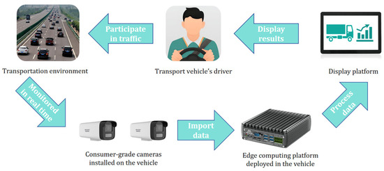 The analysis of existing research results indicates that intelligent driving technology can already provide early warning and monitoring of hazardous road conditions and obstacles during the driving process of explosives transport vehicles. However, there remains a significant issue in the current application process: intelligent driving currently relies on embedded development, which necessitates industrial control computers and supporting sensors capable of stable long-term operation. The demand for high-end software and hardware facilities results in excessively high costs [23]. To tackle this issue, the YOLOv8 object detection algorithm, along with monocular and binocular camera ranging, is applied to establish an intelligent monitoring system for the driving environment of explosives transport vehicles. The system uses IP cameras that are flexibly arranged around the vehicle body to capture road images in real time and quickly transmits these images to an edge computing device for fast processing. The processed data will be displayed to the driver in an intuitive visual format, enabling the driver to grasp the dynamics of the surrounding environment of the vehicle in real time. With the help of this intelligent monitoring system, drivers can participate in traffic operation more accurately, so as to effectively monitor and prevent possible accidents. The application process of the system is shown in Figure 1.