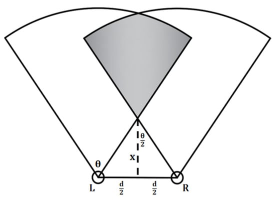 The schematic diagram of the monitoring range of the binocular camera is shown in Figure 2, where the sector depicts the field of view of a single camera, and the gray part represents the overlap of the two sectors (i.e., the monitoring range of the binocular camera). θ is the horizontal field of view angle of the camera, d is the baseline distance between two cameras, and x is the length of the monitoring blind zone. The length of the monitoring blind zone x is proportional to the baseline distance d, and d can be determined as Equation (1).