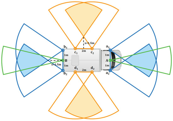 A box truck (6 m long, 2.2 m wide, and 2.3 m high) was selected to evaluate the camera layout. It is appropriate to specify a monitoring blind zone of 1.5 m for monitoring, so the baseline is 2 m. The resulting camera layout and detection scale, based on the above analysis, are detailed in Table 3 and Figure 3.
