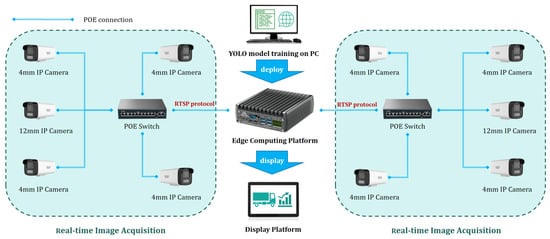 - Data acquisition: IP cameras installed in the transport vehicle body are responsible for capturing the environmental image of the vehicle in real time. Through real-time transport protocol (RTSP) and power over Ethernet (PoE), these image data are efficiently transmitted to network switches and then routed to edge computing devices.