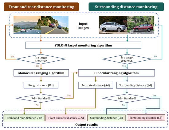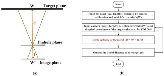 Firstly, the camera is calibrated to determine its pixel focal length. Subsequently, this focal length and the true width of the vehicle (W) are input into the system. The image is then imported, and the system is provided with the target detection box width (W′) calculated by YOLOv8, as well as the pixel coordinates of the target. Using these values, the target’s real-world distance is calculated using Equation (5). The final ranging result is then output. The schematic diagram and flow chart of the monocular ranging algorithm are shown in Figure 8.