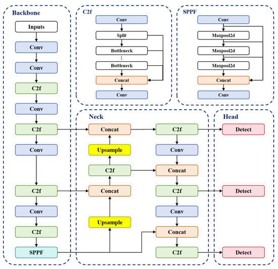 YOLOv8, an object detection model known for its accuracy and fast inference, consists of three key components: Backbone, Neck, and Head. The Backbone extracts features using convolutional and deconvolutional layers, with residual connections and bottleneck structures to optimize network size and performance. It uses the C2f module, which has fewer parameters and better feature extraction than YOLOv5’s C3 module [26]. The Neck module enhances image representation by merging features from different stages of the Backbone, including an SPPF module, a PAA module, and two PAN modules. The Head module handles object identification and classification, with a detection head made up of convolutional and deconvolutional layers using global average pooling to produce the classification results. The network’s structure is illustrated in Figure 6.
