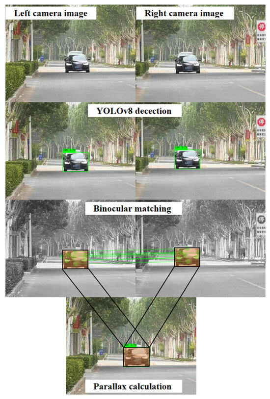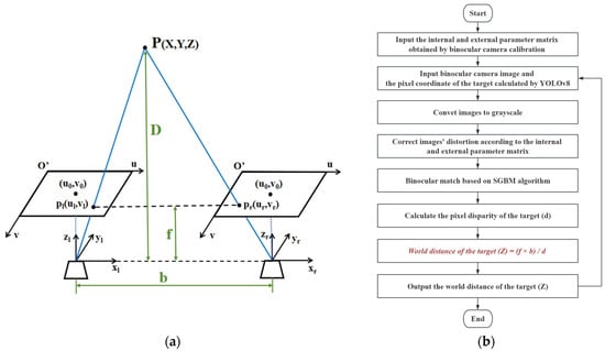 Initially, binocular camera calibration is conducted to derive the internal and external parameter matrices essential for rectifying the binocular camera system. Subsequently, the image captured by the binocular camera and the target’s bounding box pixel coordinates, as ascertained by the YOLOv8 algorithm, are input into the system. The image undergoes conversion to grayscale, and distortion is rectified utilizing the calibrated internal and external parameter matrices. Thereafter, the Semi-Global Block Matching (SGBM) algorithm is engaged to perform stereo matching, which ascertains just the pixel parallax at the target’s bounding boxes. Armed with these data, the target’s real-world distance is computed employing Equation (6). Finally, the calculated world distance of the target is output. The flow chart of the binocular ranging algorithm is shown in Figure 9b and Figure 10.