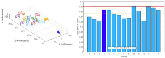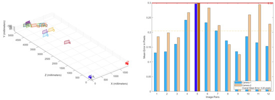 The checkerboard calibration method is used to calibrate the monocular camera and the binocular camera with a baseline distance of 2 m. The calibration board is a Zhang Zhengyou checkerboard with a grid side length of 28 mm and a black and white grid count of 10 × 7. The reprojection error is obtained by calibration, and the points with a large error are selected for elimination. Finally, the pixel focal length of the monocular camera and the internal and external parameter matrices of the binocular camera are calculated. As shown in Figure 12 and Figure 13, the reprojection errors of the monocular and binocular camera calibration meet the requirements.