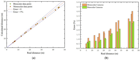 As shown in Figure 15, the measurement error of the front and rear distance of the system is controlled within 5% in the range of 50 m, which meets the requirements of error in actual driving. Compared with monocular ranging, binocular ranging shows higher accuracy. In addition, the accuracy of monocular and binocular ranging is proportional to the target distance.