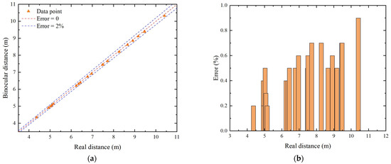 By observing the object through a binocular lens and calculating the parallax d, combined with parameters such as the baseline distance b and angle of view of two cameras, the three-dimensional coordinates of the object can be calculated using the principle of triangulation, and then the distance D of the object can be calculated using Equation (6). (f is the focal length of the cameras; X, Y, and Z are the global coordinates of the object; and xl, xr, yl, and yr are the projection coordinates of the object in the left and right cameras.) The schematic diagram of the binocular ranging principle is shown in Figure 9a.