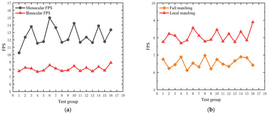 Analysis of FPS comparison. (a) Monocular ranging method and binocular ranging method based on local matching used in the system; (b) binocular ranging method based on local matching used in the system and the binocular ranging method based on full image matching without optimization.