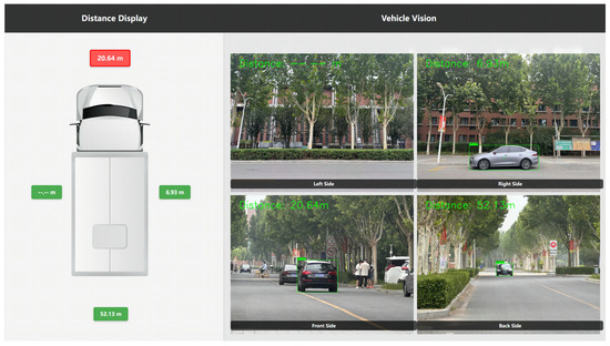 In order to verify the feasibility of the system in practical application, we designed a front-end visual interface for the system. The design of the interface is shown in Figure 19. The interface displays the actual distance between the front and back of the vehicle and the distance between the surrounding objects in real time in a visual form on the corresponding position around the vehicle. If the detected distance falls below the preset safety threshold, the interface will display the value with a striking red warning sign to immediately attract the driver’s attention. Additionally, the driver can observe the vehicle’s surroundings in real time on the right side of the interface, enabling timely corresponding driving actions and effectively preventing potential risks. In order to ensure driving safety, an audible and visual alarm system will be developed in the future: early warning can be achieved through the linkage of in-vehicle lights and sounds, and when danger is detected, lights and voice prompts will be triggered synchronously so as to improve the driver’s response speed and reduce the risk of accidents [28].