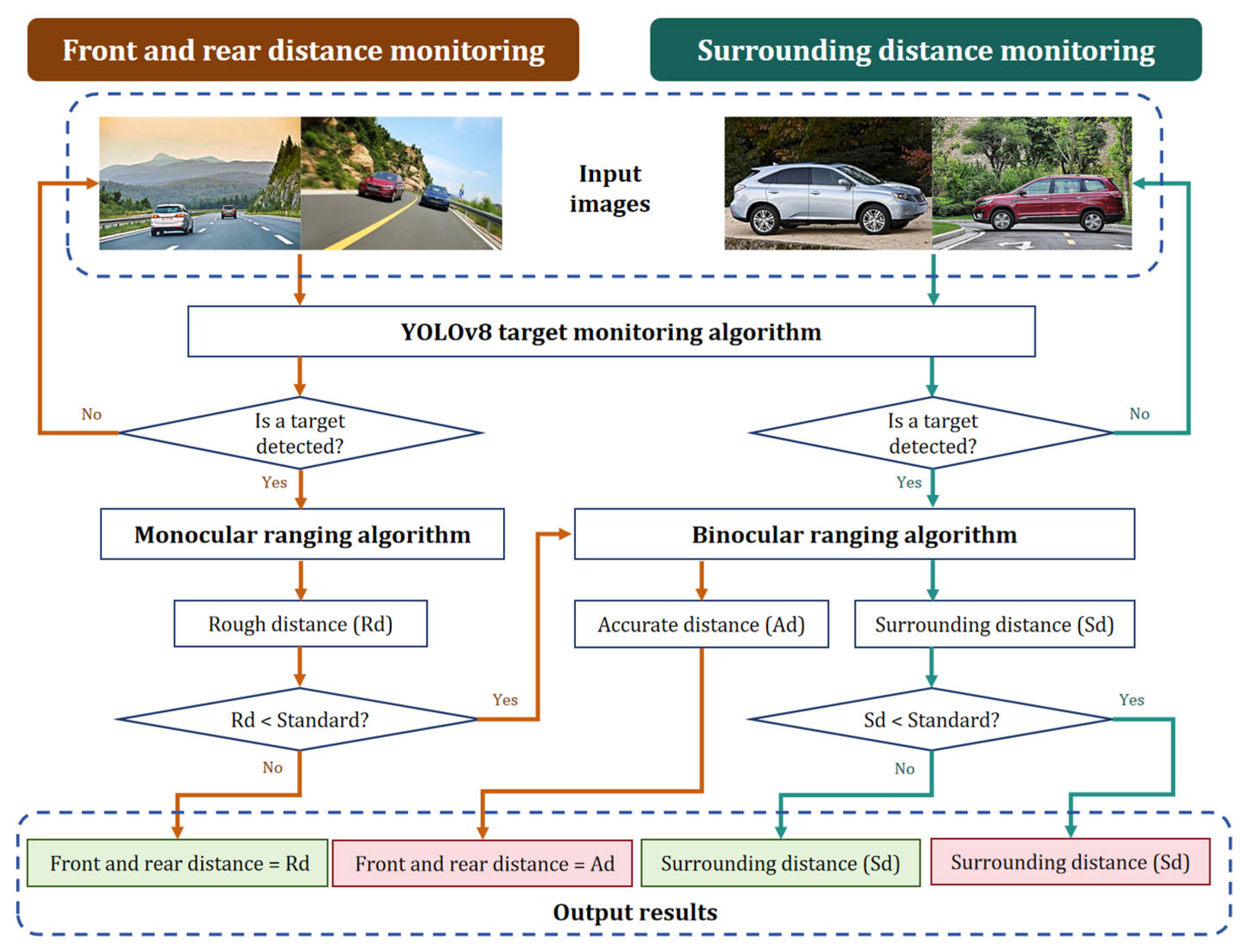 - The system integrates YOLOv8 for target detection with a hybrid ranging approach, combining the speed of monocular ranging and the precision of binocular ranging. This dual-mode strategy ensures rapid warnings for distant obstacles and accurate measurements in high-risk proximity zones, tailored to the unique demands of explosive transport.