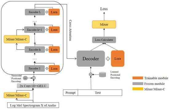Whisper [2] is a transformer-based encoder–decoder model for handling various speech tasks, including speech recognition, speech translation, language identification, etc. Assuming the input log-Mel spectrogram feature vectors denoted as , and a target transcription is represented by a sequence of N tokens denoted as . The input X is initially processed by two 1-dimensional convolution layers, and is then encoded to the hidden vector H by the encoder of Whisper. Next, the decoder consumes H, a prompt S, and the previously generated tokens as inputs to predict the next token . The whole process can be described as follows: