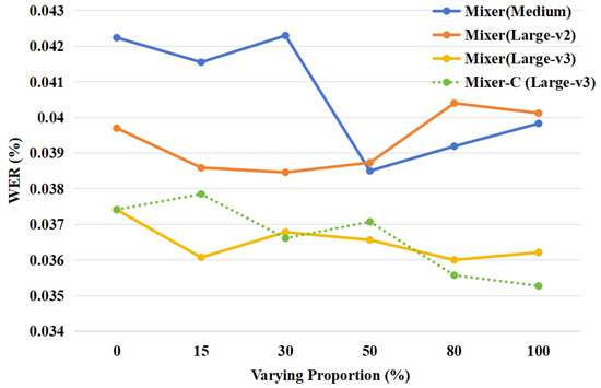 The Effect of Different Mixing Proportions. We conducted an analysis on the influence of varying mixing proportions within Mixer, specifically examining the shifts in model performance across distinct mixing proportion of 15%, 30%, 50%, 80%, and 100%. The results are shown in Figure 3. Our findings indicate that, for the Whisper-Large-v2 model, achieving superior performance necessitates a higher proportion. It can be found that for the Whisper-Large-v2 model, a higher proportion of data needs to be mixed to achieve better performance. Although it has a considerable capacity, the Whisper-Large-v2 model is not well versed in this specific data type, as evidenced by its poor direct testing performance. Therefore, incorporating additional information about the data distribution can further enhance its performance. Conversely, in the case of the Whisper-Medium, its limited capacity coupled with an already strong baseline performance means that excessive enhancement of the data can inadvertently hinder the model’s ability to learn from genuine data to some extent. In contrast, the Whisper-Large-v3 model exhibits minimal sensitivity to variations in mixing ratios, attributed to its combination of high capacity and extensive knowledge of the data, which allows it to consistently deliver superior performance. But overall, it can be observed that the model is not very sensitive to the mixing proportion , demonstrating the superiority of Mixer. Since the analysis in Table 1 shows that the Mixer-C is more suitable for the Whisper-Large-v3 model, we only analyzed the impact of different mixing proportions on Whisper-Large-v3. For Mixer-C, it can be found that mixing more data leads to better performance. This is understandable because for models with strong baseline performance, enhancing channel information allows the model to gain a more comprehensive understanding of the speech signal, thereby improving performance.