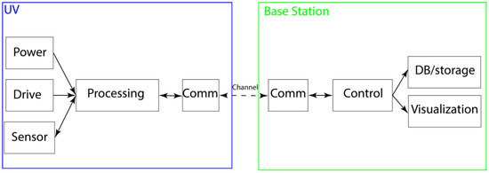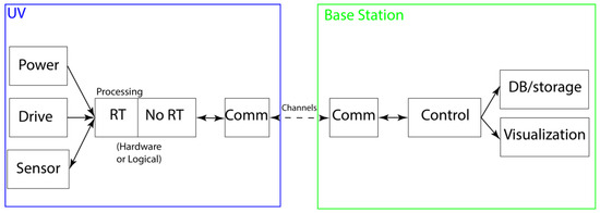 At the level of interaction between the components of a UAV, [16] presented an architecture with three blocks: aircraft, communication technology, and communication protocol. The interesting thing about this work is that in each block, they defined its parts, such as GPS, battery, and chassis, among others. This approach was preserved in [17] where the three blocks were the user interface, base station, and UAV (in this case, several). Within the UAV, only three components were modeled: control, sensor data acquisition, and planning; All stages of planning and data processing occurred at the base station, and at the end, the user was informed. This last work is perhaps the most similar to that presented in this paper, although it does not contain many of the details regarding technical, construction, or interactions between subsystems that we presented. In all cases, the use of UAVs is considered almost exclusively, so exploring generalization for UVs could generate unknown drawbacks or be directly pushed aside by the almost “dependent” UAV approach.