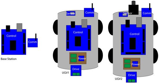 The proposed architecture was validated with a proof of concept. Two vehicles and a base station, equipped with a UV communication repeater, were built (Figure 2). The UVs (blue and green boxes) of this implementation are shown next to the ground station (red box), which is connected to a PC. The UVs can be specifically classified as unmanned ground vehicles (UGVs), although they have also been called unmanned terrestrial vehicles (UTVs). Despite the different environmental conditions, the vehicles that have been used in planetary explorations (called rovers) have clear conceptual similarities, at least in terms of architecture. The objective of the complete system is to collect photo-graphic samples of a geographical area to be covered with the UGVs. Therefore, the complete system is composed of a sensor vehicle equipped with a camera, a vehicle that acts as a repeater, and the base station.