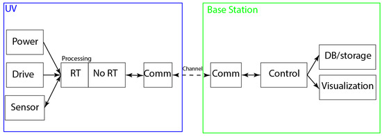- Storage (“DB/storage”): The data collected by the UVs through the sensors. Depending on the application and computing requirement, it is possible that most of these data will be analyzed asynchronously.