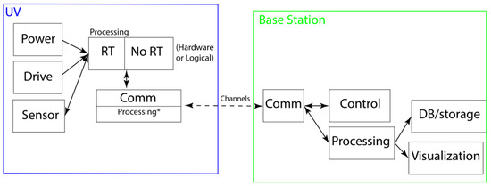 So far, the evolution of the architecture has been focused on the UV, but it is important and necessary to include the details of the base station. The base station is the part of the system that will provide instructions to the UV, process all the data, and send information to the user. Before showing the final version of the architecture of the UV, two options are presented. The first option involves the modification of the communication subsystem that allows the processing of the movement data. The second option is the evolution of the heterogeneous proposal, now with the option to divide the RT and no RT tasks using logical or hardware solutions. This approach is also used in the first option.
