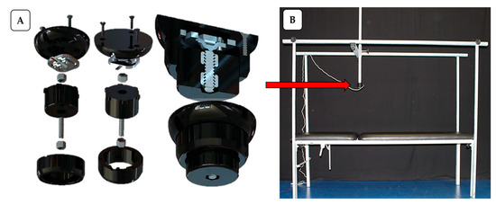 (A) Load cell encapsulation—detailed and expanded model of the assembly and encapsulation of the load cell in a cross-section; (B) final assembled structure—dynamometer fixed in the metal structure, present in a cushion table.