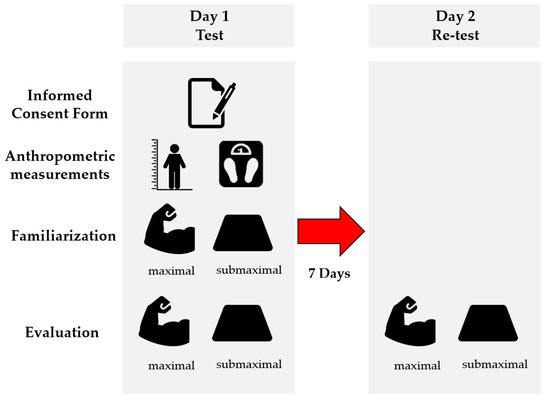 Experimental procedures. The figure illustrates the test and retest protocol in two steps separated by an interval of 7 days. On the first day (test), participants complete an informed consent form, undergo anthropometric measurements, and perform a familiarization and assessment phase with maximal and submaximal strength exercises. On the second day (retest), only the evaluation of the same exercises takes place to compare the results with the first test.