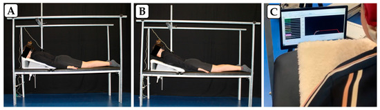 The volunteer was instructed to perform the spine extension, starting at a 20° extension angle, as shown in Figure 3B. This posture was necessary for executing the trunk extension task correctly. The trapezoidal reference signal presented on the screen in Figure 3C was used to guide the submaximal voluntary contractions (SMVC) during the experimental procedures.