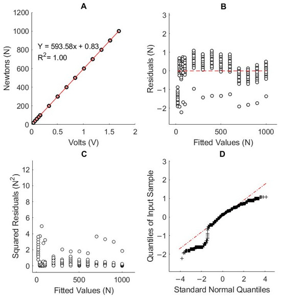 For the statistical analysis, descriptive statistics were computed for the force measurements obtained in each session. The Shapiro–Wilk test was performed to assess data normality. For the calibration data, normality was confirmed, and Pearson’s correlation was used to analyze the relationship between volts and newtons. Additionally, a residuals analysis was conducted, including residuals vs. fitted values, heteroscedasticity assessment, and Q–Q plot of residuals.