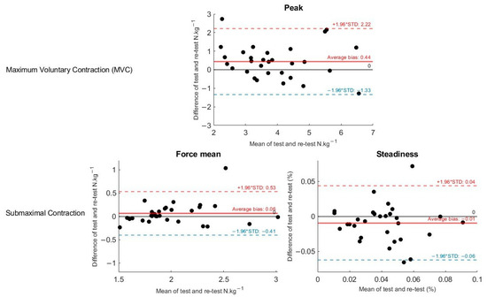 Bland–Altman plots comparing test and retest conditions for peak force, mean force, and steadiness during maximum voluntary contraction (MVC) and submaximal contraction. Legend: * Multiplication between the critical value of the normal distribution (1.96) and the standard deviation of the differences between the measurements.