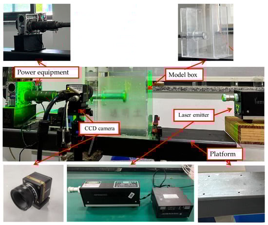 The core components of the test system include (1) the model box system and (2) the optical observation and post-processing system. The test setup is illustrated in Figure 1. The model box system consists of a model box, a platform, and a shield model. The model box has overall dimensions of 300 mm (length) × 240 mm (width) × 400 mm (height) and is constructed from 5 mm thick acrylic glass. A hole is reserved on the central axis of the front face of the model box, positioned 160 mm above the bottom. A four-hole flange is used to secure the model shield, allowing the metal pusher to move freely forward and backward through the center of the isolation plate. The tunnel is externally connected to the platform’s power equipment, with a lubricating oil seal ensuring proper sealing during the slow advancement of the pusher. The platform serves to secure both the model box and the power unit. The power equipment consists of a turbine reducer driven by a servomotor, providing stable propulsion at different speed levels with a displacement accuracy of 0.1 mm.