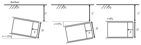 In this experiment, a case with C/D = 1 was selected to investigate the displacement variation of cross-sections under different slopes and support plate positions. A bivariate control method was employed. The slope conditions were set to i = −15%, 0%, and 15%, while the setback amounts were set to S = 3 mm, 6 mm, and 9 mm. Using an orthogonal combination test design, the three slope conditions were paired with the three setback conditions, resulting in a total of nine test scenarios. The complete test matrix is summarized in Table 2, and the experimental layout is illustrated in Figure 4. (C represents the tunnel burial depth, D represents the tunnel outer diameter, and S represents the setback amount.)