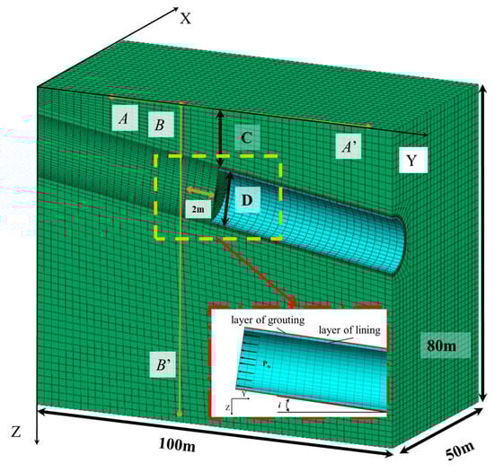 To clarify the destabilization failure mode of the soil under the limit state of a longitudinal slope shield tunnel, a 3D finite element model with dimensions of 100 m (length) × 100 m (width) × 80 m (height) was established using FLAC3D software, based on the transparent soil test, as shown in Figure 5. The front, back, left, and right boundaries of the soil model were constrained in the X and Y directions, while the bottom surface was fully constrained in all three directions. The upper surface was set as a free surface at the ground level to ensure that the vertical deformation of the model was not restricted by boundary conditions.