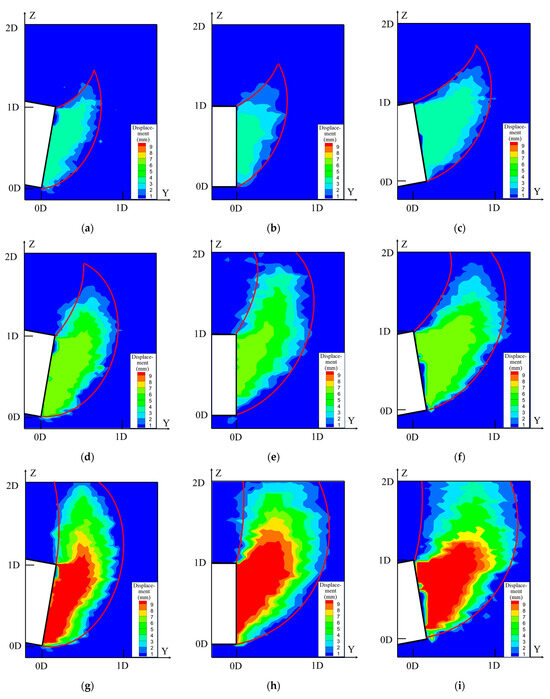 Longitudinal section displacement contour maps for slopes of i = −15%, 0%, and 15% with a setback of S = 3 were obtained from the transparent soil experiment and are presented in Figure 6a–c. Figure 6d–f present the displacement contour maps of the soil in front of the excavation face for three slope conditions at S = 6 mm. Furthermore, Figure 6g–i present the displacement contour maps of the soil in front of the excavation face for three slope conditions when S = 9 mm.