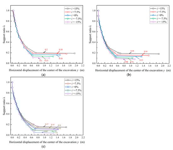 The changes observed in the development process of the transparent soil tests indicate that the magnitude of the support force is a critical factor in triggering the transition from local to global instability. To facilitate the description of the relationship between support pressure and excavation face stability, the support ratio is defined as λ = Pu/Pu0 [24]. In the numerical simulation, a uniformly distributed support force is applied. The support ratio is gradually reduced in a stepwise manner during each calculation cycle. After each reduction, the corresponding limit support ratio of the excavation face is determined based on the control method of the numerical simulation by detecting and recording the results. Figure 8 illustrates the relationship between the horizontal displacement (y) at the center of the excavation face and the support ratio (λ) for different burial depth ratios.