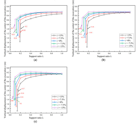 Figure 9 illustrates the relationship between the vertical displacement (z) and the support ratio (λ) at the excavation face under different burial depth ratios. The study reveals that under varying burial depths, as the support ratio decreases, the slope has a significant impact on the vertical displacement at the center of the excavation face. Specifically, a larger slope results in greater vertical displacement in the soil at the excavation center, a pattern consistent with the variation of horizontal displacement at the same location. Under an upward (elevated) slope condition (i > 0), the soil at the excavation face is more prone to increased vertical displacement. This phenomenon can be attributed to the direct stress exerted by the overlying soil on the excavation face, which facilitates the downward sliding of the soil in front of the excavation.