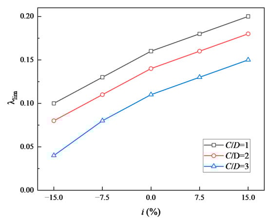 Figure 10 illustrates the relationship between the ultimate support ratio (λlim) and the slope (i) for different burial depth ratios. For varying burial depth ratios (C/D), a clear positive correlation is observed between λlim and i. As the longitudinal slope increases, the ratio rises significantly, while the rate of increase remains approximately constant. This indicates that an increase in slope exacerbates the sliding tendency of the soil in front of the excavation, thereby reducing the stability of the surrounding soil. Consequently, greater support strength is required to counteract this sliding tendency. Furthermore, as the burial depth increases, the Mohr–Coulomb strength criterion suggests that the confining pressure effect enhances the shear strength of the soil. Additionally, the arching effect facilitates stress redistribution, thereby improving the stability of the surrounding rock.