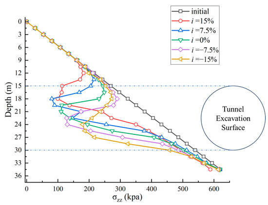 Excavation of a shield tunnel results in stress redistribution within the surrounding soil. The vertical, horizontal, and shear stresses initially carried by the surrounding soil are released due to tunnel excavation. This sudden stress release may lead to ground subsidence or lateral deformation [26]. To better analyze the stress variations induced by shield tunnel excavation, the B–B′ line, located 2 m in front of the excavation face center, was selected to extract vertical stresses in the soil. The vertical stress distribution in the soil 2 m ahead of the tunnel excavation was then analyzed under different slope conditions, as shown in Figure 11.