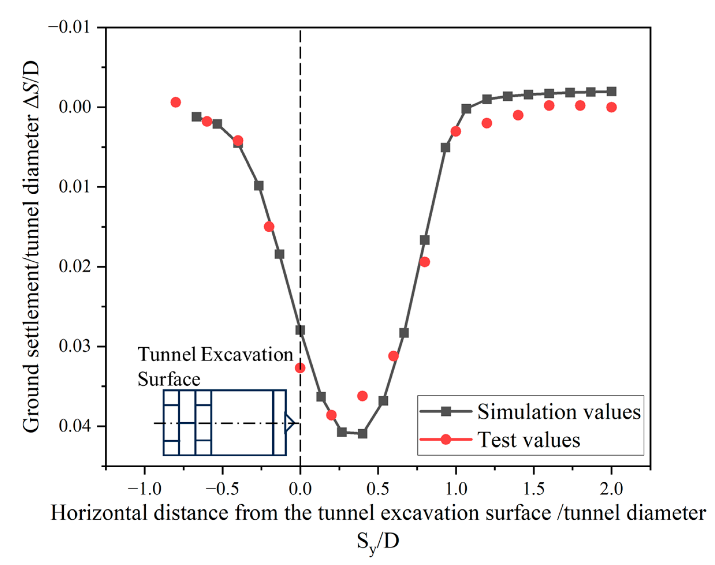 The surface displacements obtained from the numerical simulation for C/D = 1, i = 0% were compared with the surface displacements extracted along line A–A′ under the corresponding conditions from the transparent soil model test, as shown in Figure 7. The experimental data were extracted along the ground surface section A–A′ under corresponding conditions using the PIV technique implemented via MicroVec V3 software. To allow comparison across different model scales, all relevant displacement and distance parameters were normalized using the tunnel diameter (D) as the reference length. The maximum surface settlement occurs within the range of 0.33D to 0.66D in front of the tunnel cross-section, while the influence range of surface settlement extends from −0.5D to 1D. Moreover, the error between the two results remains within the acceptable range. Therefore, the numerical simulation results presented in this study are considered reliable.