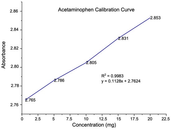The calibration curve was prepared using known contents of acetaminophen as the active ingredient, and from this curve, the content in the biopolymeric film was determined according to the Beer–Lambert law. The analysis was performed by ultraviolet-visible spectrophotometry at 243 nm, preparing five calibration standards (20, 200, 400, 600, and 800 g·L−1) from a 1% aqueous solution prepared with reference standard acetaminophen. Figure 1 shows the results of the absorbances at each of the known contents. The experimental value of the proportion in the film was determined from the equation of the straight line obtained by linear regression. The calibration curve obtained for quantification presented good linearity and a high correlation coefficient value (R2 = 0.9983), ensuring the accuracy of the calculated values.
