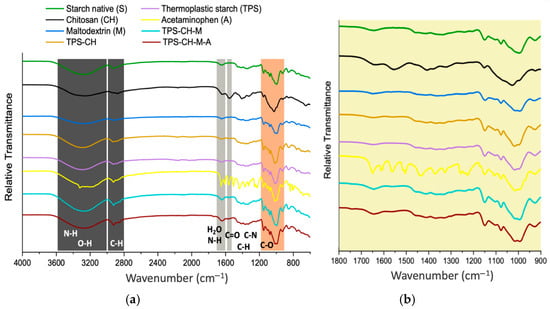 Figure 2 shows the spectra obtained from the natural polymers—starch, chitosan, and maltodextrin—where a broad band associated with bond stretching is observed in the large region from 3600 cm−1 to 3100 cm−1. This band corresponds to the O–H stretching of the multiple hydroxyl groups present in both the participating molecules (glycerol, A) and macromolecules (biopolymers). In this same region, the vibration of the amino group (N-H) corresponding to chitosan (CH) and acetaminophen appears to be located. Next, defined bands corresponding to asymmetric and symmetric stretching of C–H bonds were observed between 2925 cm−1 and 2850 cm−1, respectively. These vibrations are related to the hydrocarbon chain, methyl, and methylene groups present in the different organic compounds. At a wavelength of ~1680 cm−1, the vibrational stretching mode of the carbonyl (C=O) present in the amides of chitosan is shown, which is partially deacetylated (up to 75%) and acetaminophen [35]. A nearby band appears at 1695 cm−1 of the water molecule, which achieved strong interactions with the other components until crystallization was achieved in the system. Another region of great importance in the spectrum corresponds to C–O interactions (ether zone) that begin at ~1300 cm−1 up to 949 cm−1 [36]. In this area, significant changes are evident corresponding to hydrogen bond interactions between the different components as has been discussed and published in previous works. Finally, it was found that in the area known as fingerprints, bands appear at 838 cm−1 and 514 cm−1 which are related to characteristic vibrations of the disubstituted aromatic ring in the para (p-) position and the deformation of the phenyl ring outside the plane, respectively. For the TPS-CH-M-A samples, some intensity changes can be seen in characteristic bands for APIs over the control (TPS–CH–M) as a result of the addition of =C–OH groups of the phenol (as part of the molecule of acetaminophen). Also, a change is observed in the ratio of bands 1016 cm−1 and 990 cm−1 that becomes similar to the API in the TPS–CH–M–A with respect to TPS-CH-M. This broadening is attributed to limited intermolecular interactions due to the incorporation of the aromatic molecule, which induces steric hindrance and reduces polarity in the mixture. Overall, no new bands indicative of intramolecular reactions among the components were detected. This is crucial for application purposes, as maintaining the active component’s structural integrity is essential.