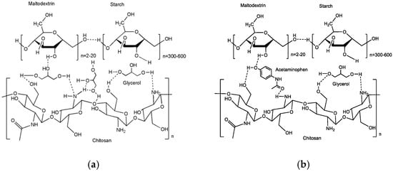 Previously, the presence of functional groups in the polysaccharides used—starch, maltodextrin, and chitosan—was discussed. The prominent –OH and –NH2 groups confer hydrophilic properties. Furthermore, chitosan exhibits biosorbent qualities, including cationic and macromolecular structures with excellent sorption capacity [37]. According to studies conducted by Nawaz et al. (2023) [38], various interaction mechanisms involving biopolymers have been identified, such as electrostatic attraction, electron donor–acceptor interactions (π–π), and hydrogen bonding [39]. In this case, acidic conditions are employed to solubilize chitosan and achieve optimal miscibility within the film-forming mixture, which subsequently transitions to the solid state. In solution, the capacity for interaction among components is enhanced through mechanical and ultrasonic means during mixing. The slightly acidic pH, which remains close to neutrality, maintains the positive charge of the –NH2 group, thereby maximizing adsorption. This phenomenon has been discussed by other authors through the calculation of thermodynamic properties, demonstrating that the process is spontaneous, endothermic, and based on a physisorption mechanism [40]. The interaction model proposed based on infrared analysis aligns with the representation in Figure 2a, where the individual components of each mixture, including the TPS–CH–M plasticizers, are depicted. In the case of the mixture containing acetaminophen (TPS–CH–M–A, Figure 2b), an interaction model is presented that illustrates the system’s integration, wherein van der Waals interactions play a role (see Figure 3). Due to its small molecular size, acetaminophen can readily diffuse into the matrix and distribute uniformly throughout the mixture. This facilitates maximum interaction with the biopolymers while preventing structural transformations or modifications, such as cross-linking reactions or esterifications.