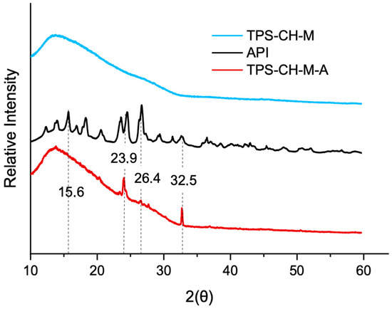 Figure 4 shows the diffraction patterns of the biopolymer films and the active ingredient, both as a mixture and independently. A broad band (<10° and ~30°) is observed in the TPS–CH–M blend, reaching its maximum at 13.8° (2θ). This result is attributed to the mixture of chitosan, maltodextrin, and starch, which exhibits an amorphous structure according to the analysis. Regarding acetaminophen, the XRD pattern confirms its crystalline nature, as expected, given that acetaminophen is a drug with known polymorphic forms. The identified diffraction planes at 15.6°, 23.9°, 26.4°, and 32.5° (2θ) correspond to the (101), (211), (−20), and (−311) planes, respectively [41]. Based on the indexing of the X-ray pattern, the acetaminophen used in this study exhibits a monoclinic structure, also known as Form I [42]. The TPS–CH–M–A film displayed small peaks at 23.5° and 32.3° 2θ, which, according to the X-ray pattern of API, correspond to the API present in the edible film. The incorporation of the API into the TPS–CH–M matrix induces slight modifications in its crystalline structure, as evidenced by peak shifts toward lower angles. This shift suggests an expansion of the unit cell in Form I, which may be attributed to strong interactions between the API and the TPS–CH–M matrix, leading to subtle structural alterations in the API.