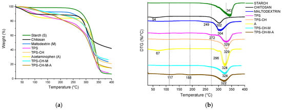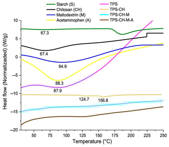 The thermal behavior of the films based on starch, chitosan, maltodextrin, and the active pharmaceutical ingredient was analyzed using TGA and DSC, as evidenced in Figure 5 and Figure 6, respectively. For the TGA curves and the respective derivatives (DTG) obtained for each polymer mentioned above, two very similar stages of mass loss are identified. The first stage occurs around 100 °C and is attributed to the loss of water and volatile components. The second stage, observed around 300 °C, corresponds to the degradation and decomposition of the compounds. Among the analyzed samples, TPS exhibits the lowest thermal stability, as evidenced by continuous weight loss with a maximum slope between 25 °C and 270 °C. Thus, the TGA thermogram of the TPS film demonstrated a weight loss in three stages. In the first stage, the loss of moisture was observed at a temperature below 100 °C. The second stage indicated the degradation of the plasticizer between 250 °C and 275 °C. The third stage is related to the decomposition of the polymeric material between 300 °C and 350 °C. The above is corroborated by the DSC curve through the endothermic peaks. As for the active ingredient, a moisture loss of ~15% is observed in the TGA curve, followed by excellent stability in which the mass content is not altered. The initial degradation temperature (T0) is observed at 272 °C, and it ends at 354 °C (final degradation temperature, Tf). The thermal behavior of the ternary TPS–CH–M mixture suggests the presence of weak intermolecular interactions. In polymeric systems, high viscosity in physical mixtures, along with steric hindrance caused by coiled polymer chains, limits the extent of interaction between components [43]. The TPS–CH–M blend presented a maximum degradation temperature equal to 290 °C, while the TPS–CH–M–A blend decreased its value significantly by 20 °C. The incorporation of the API in a solid state is distributed and inserted between the polymer chains, limiting the interactions and blocking the dissipation of thermal energy [44]. DSC provides insight into the thermal transitions characteristic of different materials. Neat starch exhibits a second-order transition (see broad band between 50 °C and 65 °C). On the other hand, starch in the presence of plasticizers and under thermomechanical process conditions presents an increase in heat absorption due to the change in the polymeric network. This process, known as gelatinization, is highly dependent on plasticizer content. For TPS, a transition in heat flow is observed beginning at approximately 50 °C and reaching an endothermic minimum at 87.9 °C. This process concludes around 150 °C. Similarly, maltodextrin presents a less pronounced endothermic event near 100 °C. The glass transition of chitosan occurs at 67.4 °C within an endothermic band extending up to approximately 100 °C, which is associated with the evaporation of solvents, such as water and acetic acid. The TPS–CH and TPS–CH–M mixtures undergo complete gelatinization due to extensive intermolecular interactions between the polymeric components. These blends demonstrate enhanced thermal stability, as corroborated by TGA, which reveals an increase in degradation temperatures. Additionally, the thermal transitions are delayed, with a glass transition temperature (Tg) of 124.7 °C and a melting temperature (Tm) of 156.8 °C. These results are not comparable to those obtained in the molten state or through reactive extrusion, emphasizing the significance of processing variables during mixing [45]. The melting temperature of acetaminophen is 86.2 °C, with around 40 °C above and below due to the polymorphism that this compound experiences [46,47]. The glass transition of TPS–CH–M–A is around 70 °C, located within an endothermic peak that continues up to 110 °C related to the volatilization of solvents and plasticizers. In the case of TPS–CH–M, the melting temperature and the glass transition peak are not detected. The above highlights the susceptibility to change experienced in the polymeric matrix due to interactions of the active ingredient [48].