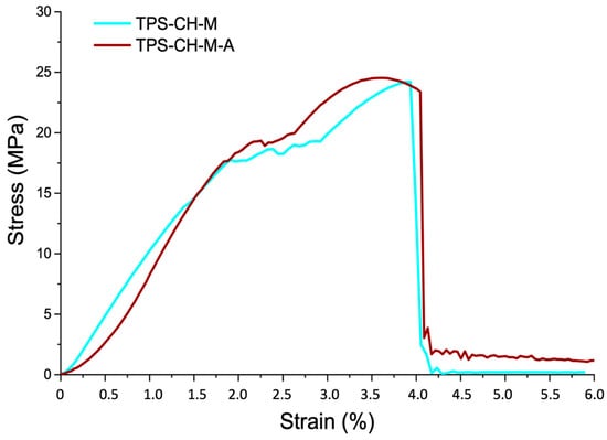 The mechanical performance of TPS–CH–M and TPS–CH–M–A are shown in Table 1. These values were calculated from the stress–strain curves obtained from uniaxial tensile tests performed until failure. Figure 7 displays the stress–strain curves of TPS–CH–M and TPS–CH–M–A films. Based on the analysis of these curves, both films exhibit two distinct regions: the elastic region and the plastic region. This behavior is characteristic of thermoplastic biopolymers [49]. In the plastic region, the TPS–CH–M film presents a smaller elastic area compared to TPS–CH–M–A. This difference results in a higher elastic modulus for the film containing the API, increasing from 9.27 MPa in TPS–CH–M to 9.38 MPa in TPS–CH–M–A. This increase can be attributed to the incorporation of the API, which introduces an elastomeric behavior at the onset of the elastic region [50]. Additionally, the narrowing of the yield zone in the API-containing film leads to a lower yield point of 17.67 MPa for TPS–CH–M–A compared to 17.17 MPa for TPS–CH–M. The incorporation of the API also affects the failure behavior of the film, causing it to break with minimal non-uniform plastic deformation. In TPS–CH–M, the tensile strength at yield and the breaking point are both 24.21 MPa, whereas in TPS–CH–M–A, these values differ, with a tensile strength at yield of 24.54 MPa and a breaking point of 23.39 MPa. Overall, the incorporation of the API enhances the film’s toughness, increasing it by 8%. Consequently, the addition of the API to the edible film improves its mechanical properties.