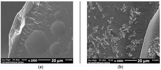 SEM micrographs of (a) TPS-CH-M and (b) TPS-CH-M-A films.