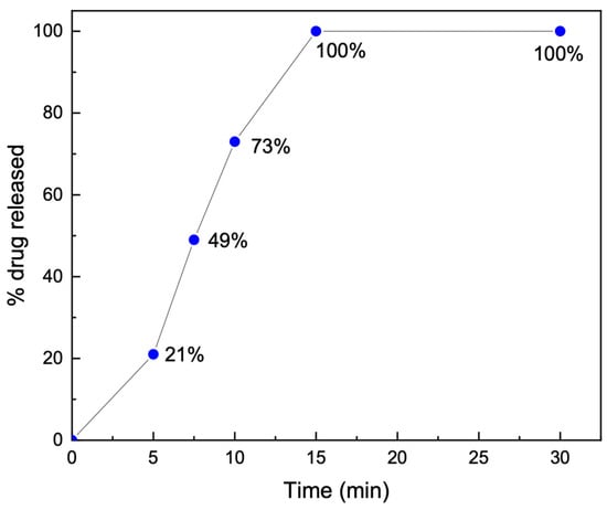 Gradual measurements of the release profile of the API incorporated in the polymeric matrix were made from dissolution. The release was evaluated by determining the concentration of the compound over time. To simulate the salivary mucosa, the analysis was conducted in an aqueous medium at pH 6.8. The results indicated that the polymeric film released approximately 73% of the API within 10 min and achieved complete release within 15 min, maintaining a constant proportion after 30 min (See, Figure 9). Given these results, the proposed ODF can be classified as a very fast dissolving dosage form, since, according to the WHO, a drug is considered very fast dissolving when no less than 85% of the labeled amount of the drug has dissolved in 15 min, at pH 6.0 and 7.4 under the established conditions [58]. The fast release time obtained is directly attributed to the polymers used in the preparation of the ODF, since the release rate can be influenced by hydrophilic or hydrophobic characteristics of all the components of the matrix; in addition, the interaction between them can significantly influence the dissolution rate of the active ingredient. Generally, the presence of hydrophilic polymers such as chitosan or starch facilitates rapid dissolution upon contact with saliva, thereby efficiently releasing the active compound [59]. Under these conditions, the film demonstrated a low disintegration time (<60 s), meeting the European Pharmacopoeia (Ph. Eur.) standard [60]. The acceptance criterion for ODF disintegration time is classified as “fast”, ranging between 30 and 180 s [21]. According to the physicochemical characterization of the TPS–CH–M and TPS–CH–M–A films, the incorporation of API at 0.5% w/w into the TPS-CH-M filmogenic solution resulted in a film with suitable properties for ODF applications. This film exhibited a density of 1.554 g/mL, and API quantification confirmed that the model drug accounted for approximately 11.75% of the total polymer film mass. Given that a typical ODF measures 3 cm × 2 cm, the total mass of the TPS–CH–M film is approximately 37.2 mg, with a total drug load of around 4.37 mg. Therefore, this film could serve as a potential platform for delivering drugs with a similar dosage requirement, such as naloxone, which is used for rapid opioid overdose reversal at a dose of approximately 0.4 mg. Additionally, this system could be adapted for drugs soluble in water, ethanol, or ethanol/water mixtures, such as loperamide, which is used for the treatment of acute diarrhea.