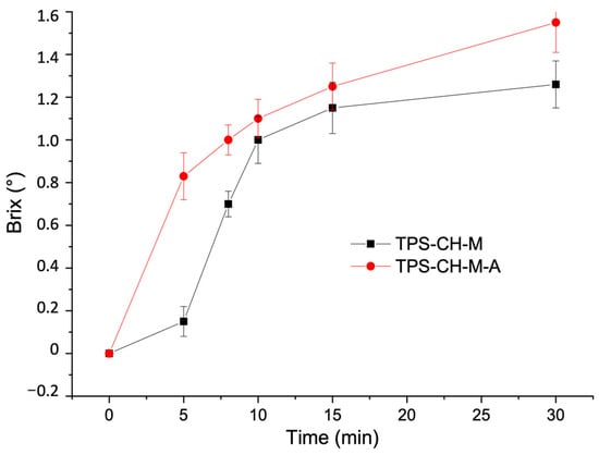 The sugar content of the samples was determined under the same conditions as the in vitro dissolution tests. Figure 10 shows dissolved sugars (°Brix) results for the TPS-CH-M and TPS-CH-M-A samples. In general, an increase in values is observed as the dissolution time progresses [61]. This effect is more pronounced in the first 5 min for the TPS-CH-M-A sample compared to TPS–CH–M. The increase in values is indicative of the release of the oligosaccharide maltodextrin into the solution and partial disintegration of the starch [62]. This phenomenon is attributed to the free volume generated by acetaminophen particles within the polymer chains. The presence of these particles creates spaces that facilitate water molecule penetration during dissolution. This behavior is similar to that observed in microencapsulation systems composed of polysaccharide mixtures, as reported by Zahid-Hasan et al. (2023) [63]. Additionally, these findings corroborate the results discussed in Section 3.7, which explain how dissolved sugars in the formulations contribute to moisture absorption, thereby limiting the availability of free water in the medium. After 10 min, the sugar content values of both samples became comparable, and at this stage, their impact on ODF applications is considered negligible.