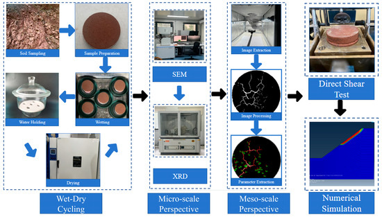 Building on our foundational investigations of geotechnical properties, this study extends its scope to include a series of advanced experiments under wet–dry cycling conditions. These include pore characteristic tests, crack development tests, direct shear tests, SEMs, and XRDs. By integrating fundamental theoretical knowledge with advanced image processing and analysis techniques, a hierarchical analysis was performed to elucidate the changes in expansion and contraction performance, micro-mineralogical and structural evolution, microscale crack development, and macro-mechanical property degradation of remolded sandy red clay samples subjected to wet–dry cycles. Furthermore, a comprehensive, cross-scale analysis was performed to explore the degradation mechanisms at the micro-, meso-, and macro-scales under wet–dry cycling. To assess the practical implications, engineering case studies were incorporated to quantify the impact of multi-scale degradation induced by wet–dry cycling on slope stability. The experimental procedures and equipment used are outlined in Figure 1.