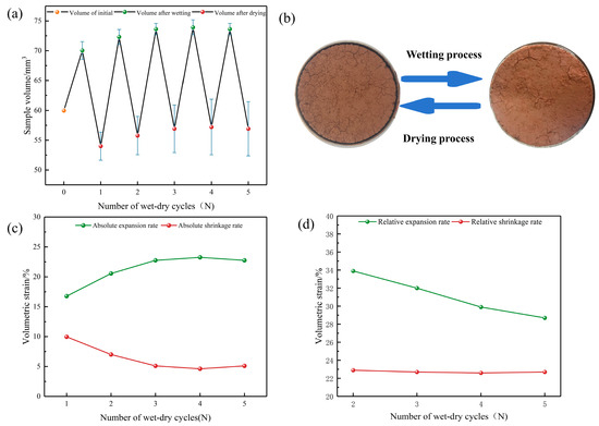 In the aforementioned formulae, δa represents the absolute expansion rate (%); ηa the absolute shrinkage rate (%); V0 the volume of the initial state specimen (mm3); Vw(i) the volume of the specimen after wetting in the ith cycle (mm3); Vd(i) the volume of the specimen after drying in the ith cycle (mm3). During the data calculation and processing, the following considerations were accounted for: ① The tool used in this study to measure the volumetric parameters was a vernier caliper with an accuracy of 0.02 mm. ② For the specimen after wetting, we assumed the diameter of the sample is consistent with the diameter of the ring cutter, which was 61.8 mm, and the height of the specimen was measured accurately using vernier calipers. ③ For the specimen after drying, their diameter and height are measured accurately with vernier calipers. ④ The accurate determination of the height and diameter of each sample necessitates performing at least three parallel measurements across diverse locations. Subsequently, the arithmetic mean of these measurements is utilized to count the volume of the sample. ⑤ The volume of the sample is taken as the average of all sample volumes, but those that deviate significantly from the others need to be excluded.