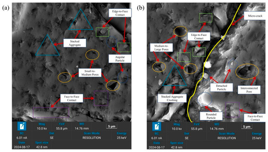 SEM technology stands as one of the most widely used and practical approaches for investigating the microscale characteristics of geomaterials. The fundamental principle of SEM is acquiring surface morphology images at the microscale by employing electronic signal imaging techniques. SEM experiments were performed on both untreated samples (N = 0) and samples subjected to wet–dry cycling (N = 5) for the acquisition of SEM images. Figure 4 presents the SEM images, where Figure 4a corresponds to the image at N = 0 and Figure 4b represents the image at N = 5. The qualitative analysis of representative SEM images reveals that prior to wet–dry cycling, the microstructure of the samples predominantly existed as stacked aggregates, accompanied by a minor quantity of slightly elevated mineral particles adhering to the surface. The particles are tightly bound, primarily through face-to-face and edge-to-face contacts, with a limited number of pores, mostly small- to medium-sized, and fewer large pores. The pore connectivity is poor, exhibiting minimal development of microscale crack. The edges and corners of the particles exhibit relative sharpness, with low roundness. The structure within the field of view is relatively compact and sturdy.