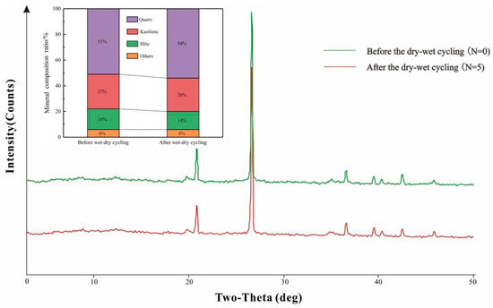 An analysis of the XRD and XRF patterns was conducted on sandy red clay samples, both before and after wet–dry cycling, reveals that the primary mineral components are quartz, kaolinite, illite, and hematite. As Figure 5 shows, the quartz content exceeds 50%. Clay minerals, predominantly kaolinite and illite, account for over 40% of the sample composition. The remaining minerals, primarily hematite, comprise less than 10% of the sample. No emergence of new diffraction peaks is observed in the XRD patterns throughout the wet–dry cycling process, indicating that wet–dry cycling does not induce the formation of new mineral components.