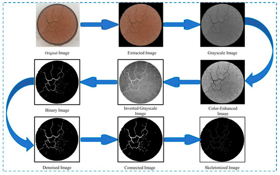 The characteristics of cracks in the soil are one of the main manifestations of the mesoscale properties of the soil. They represent a type of characteristic that lies between the macro- and micro- scales. Utilizing high-definition photographs to extract crack data is economically advantageous. The processing steps for this method are shown in Figure 6.