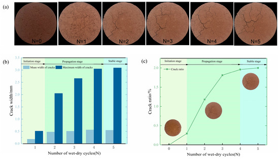 (3) The wet–dry cycling process induced the formation and progression of cracks. The evolution of cracks undergoes stages of initiation stage (N ≤ 1), propagation stage (1 < N ≤ 4), and stable stage (N > 4). As N increases, the cracks gradually expand, with the cracks developing the fastest in the propagation stage and basically stopping in the stable stage.